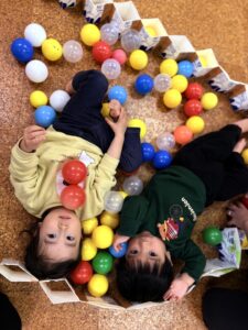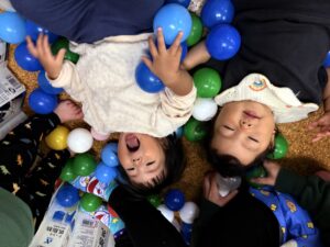ゴローンと寝転がって上からボールを降らせると「きゃー!!」と大喜びのばんびさん😍ボールを投げるのも上手になってきました☺️
