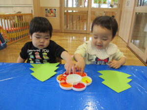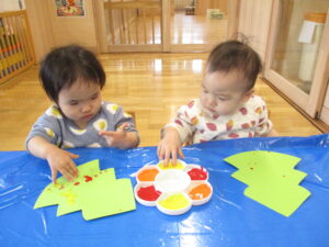 クリスマスツリーを作ったよ。指に絵の具をつけてペタペタスタンプ☆彡