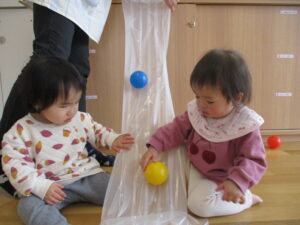 テープを貼って坂道を作り、ボールを転がして遊んだよ!