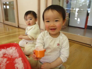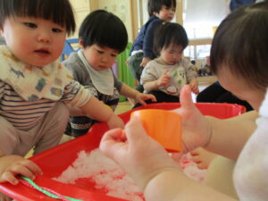 お部屋に雪を持ってきて雪遊びを楽しみました!