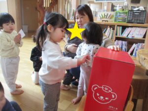 園内で『お手紙ごっこ』がありました。自分で描いたお手紙をポストに入れると、ぞう組の郵便屋さんが届けてくれます。