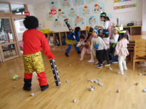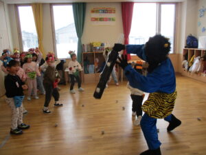 気がつくと…保育室、ホールにも鬼が!! 子ども達は、『えーい!』と新聞紙ボールで鬼退治!