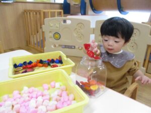 「ペタペタ」「ポン、ポン」と様々な道具や自分の手を使って絵の具遊びを楽しみました😊