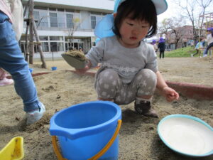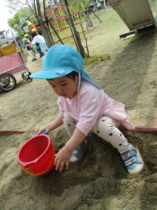 砂場ではスコップを使って砂をザクっとすくってみたり、バケツの中にサラサラと落としてみたり。