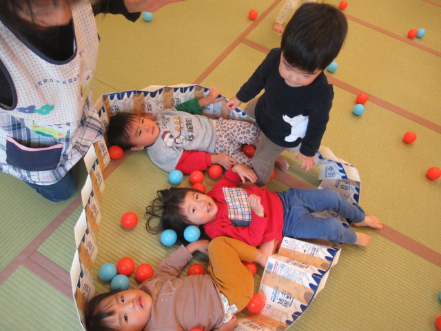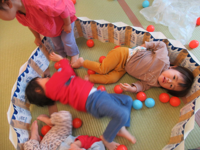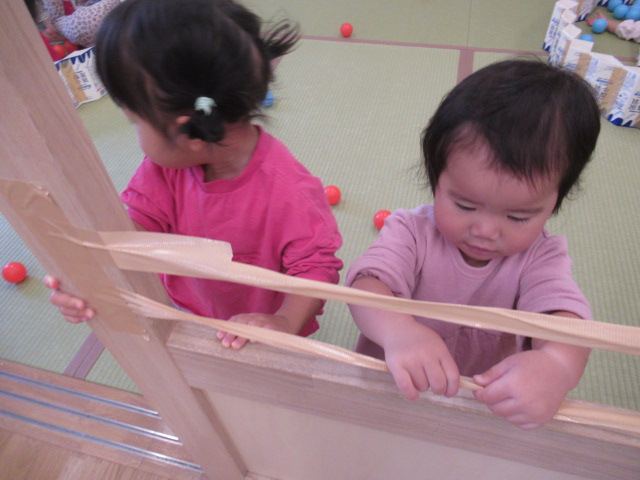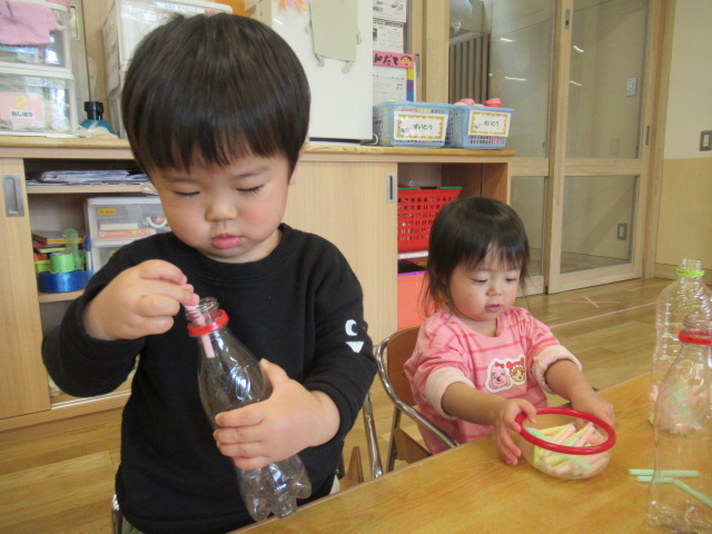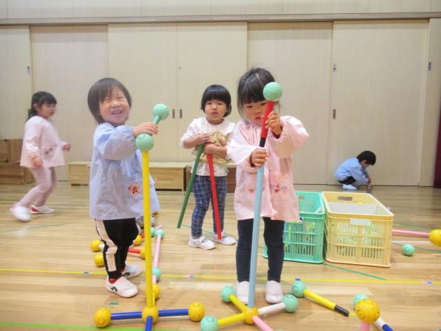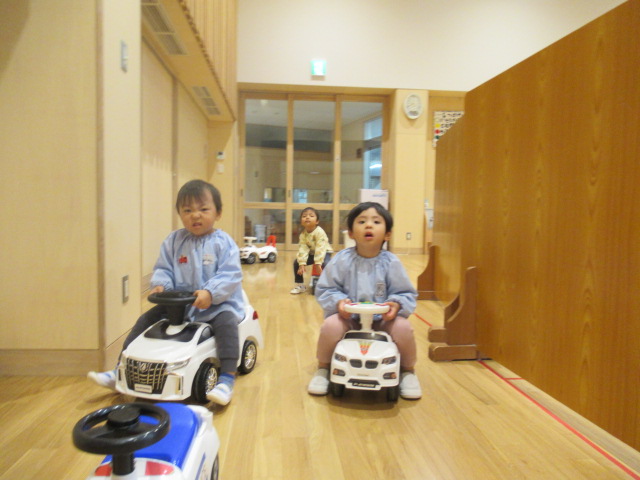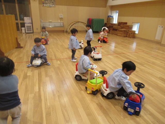つき組の2歳児りんごグループといちごグループ24名の子ども達。 遊戯室では、マイクを作って、アイドルごっこ??それとも、車でお出掛けごっこ(笑)なのかな?