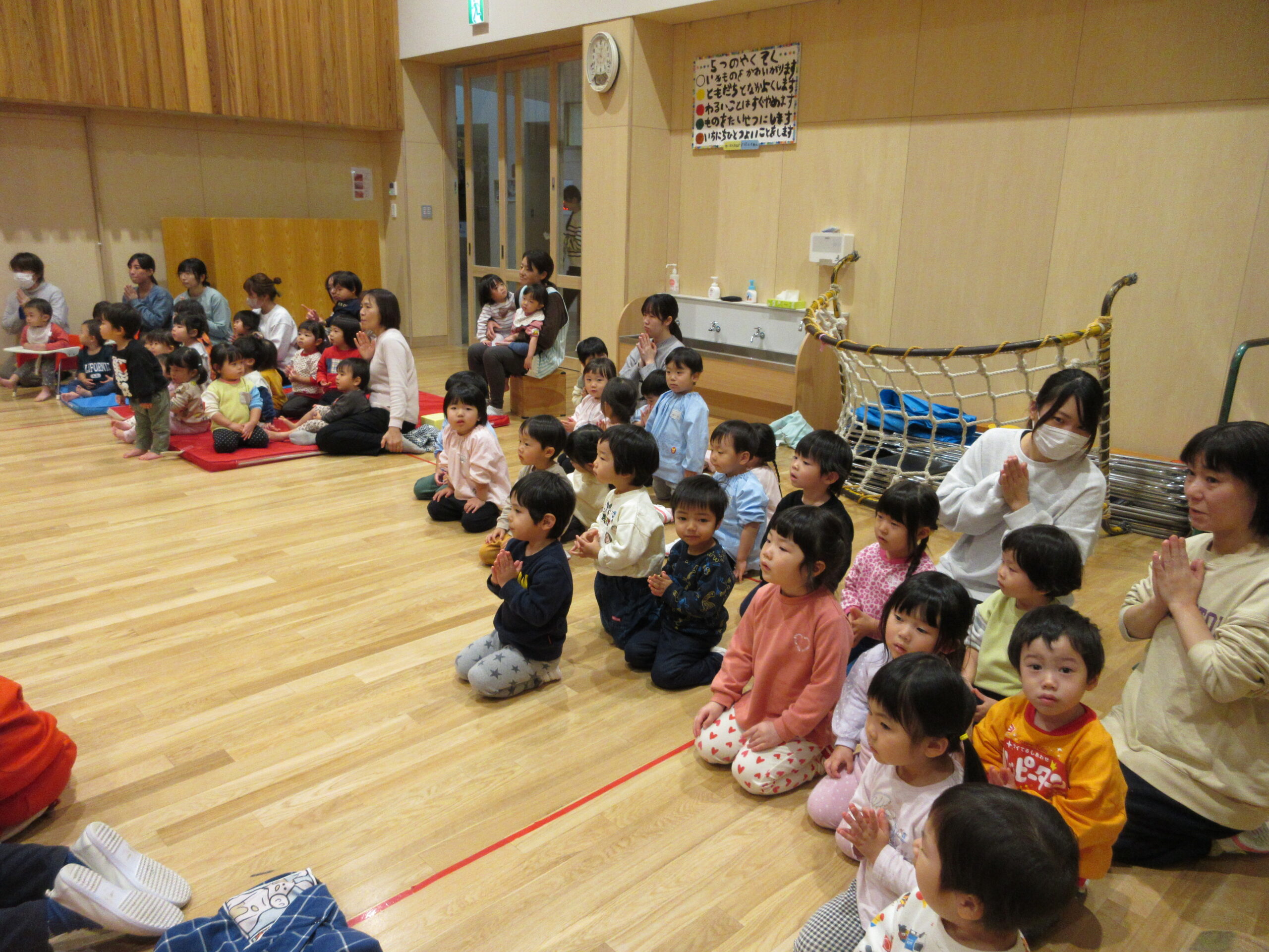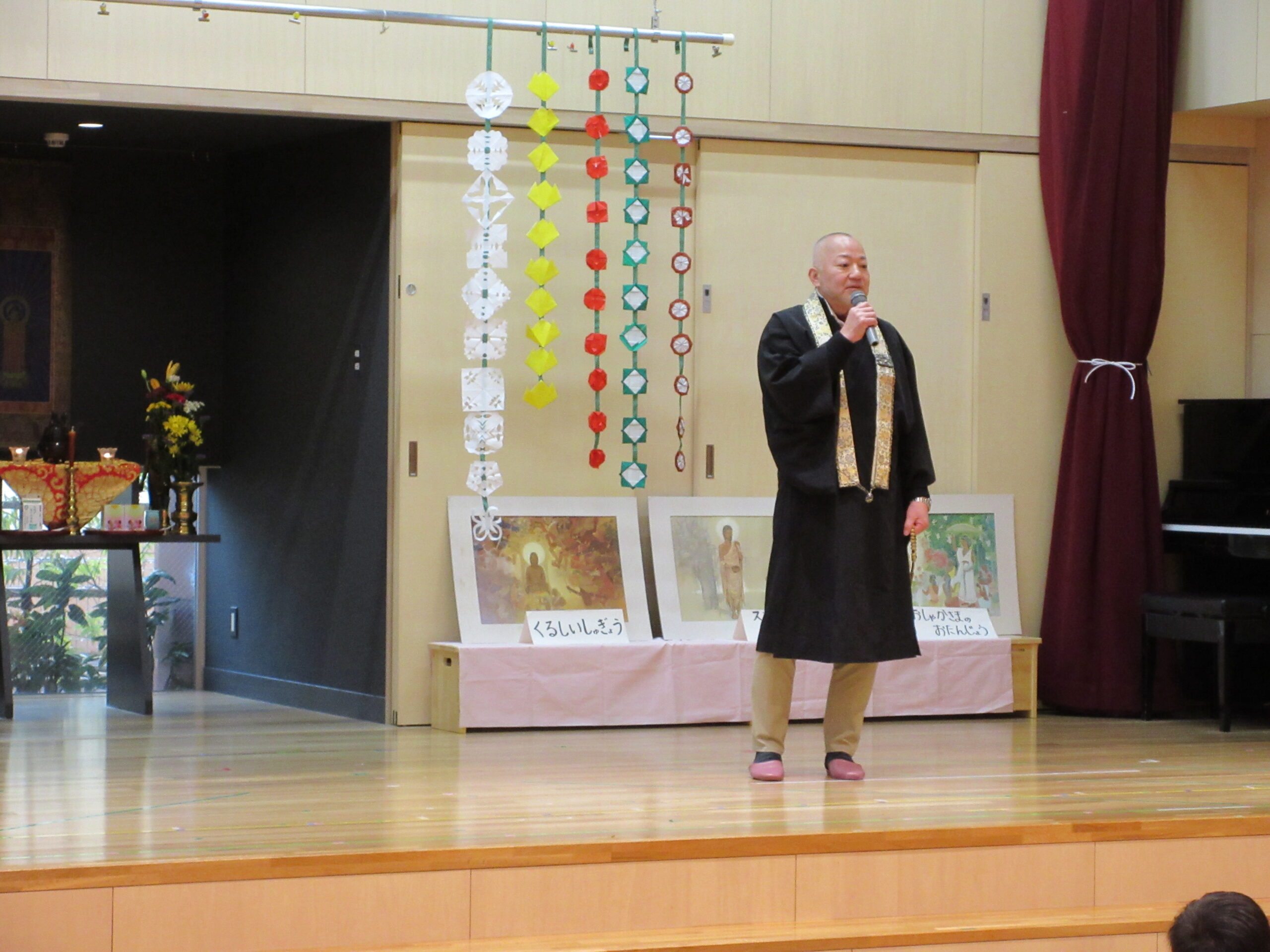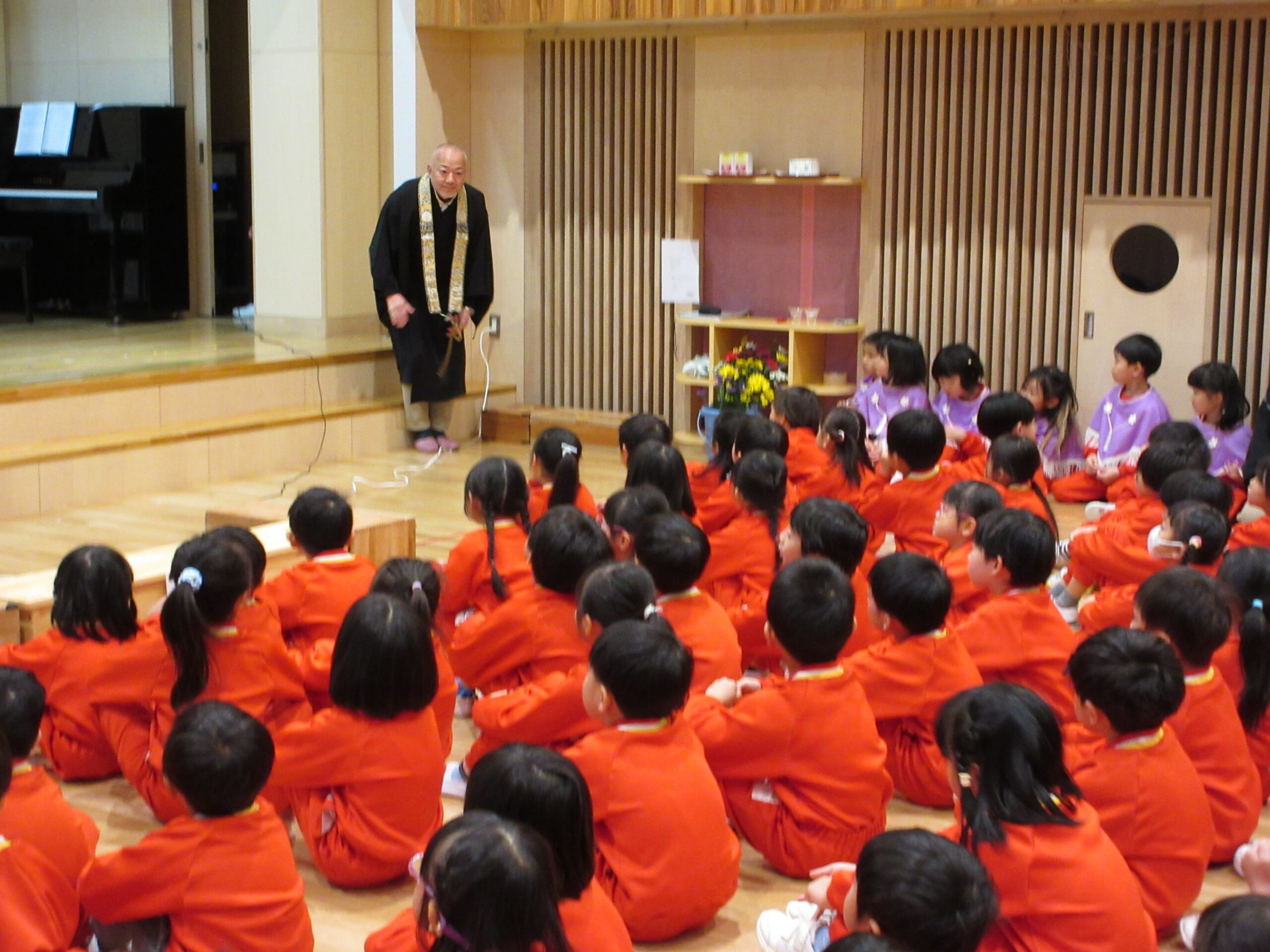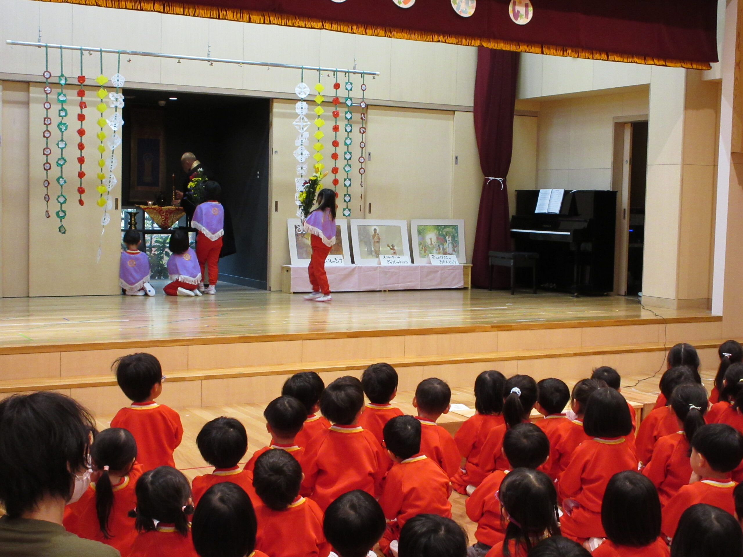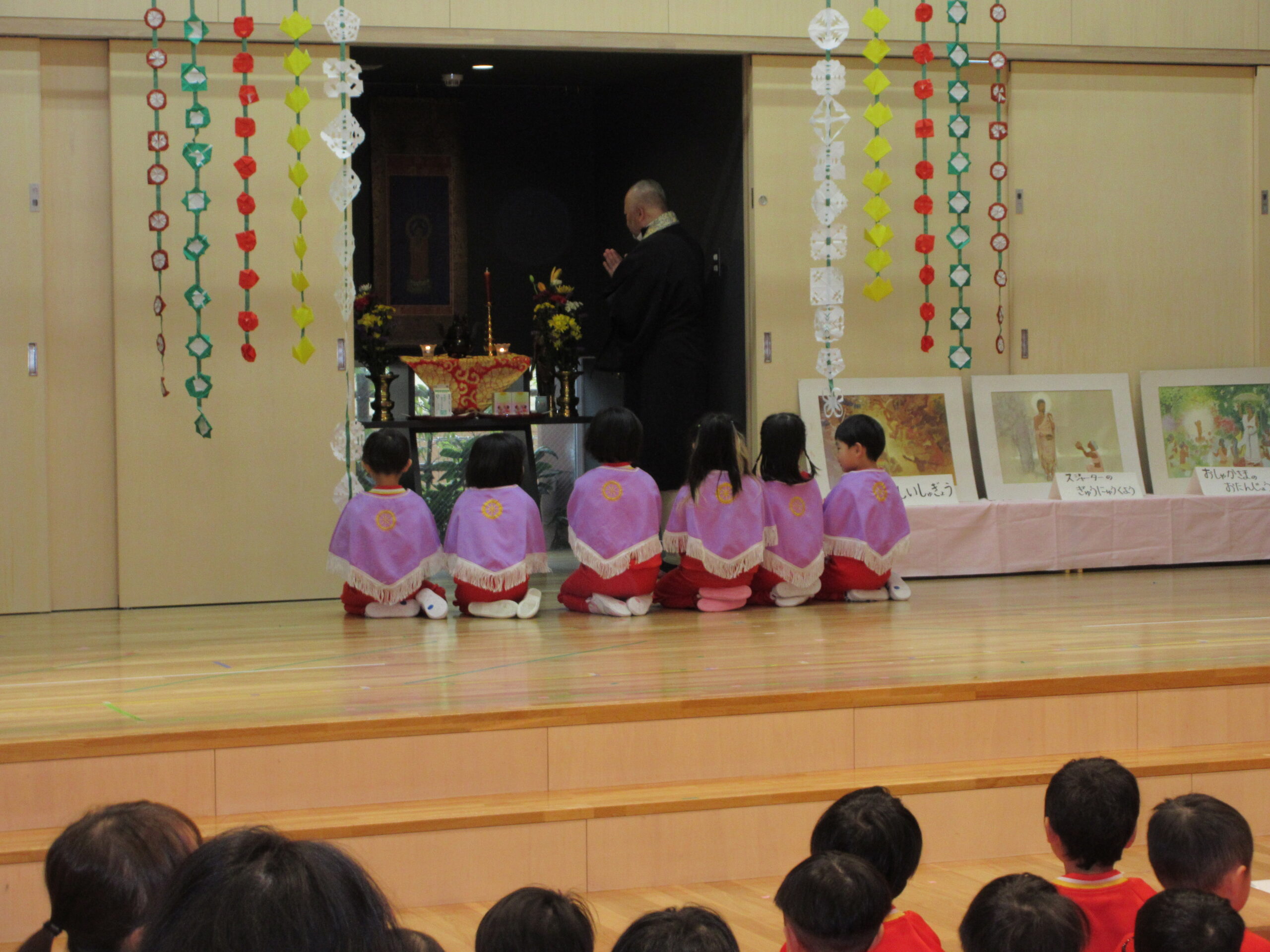 ☆成道会がありました☆ 2025/12/12 12月13日(水)成道会 おしゃかさまがおさとりを開かれた日。12月8日が本当の成道会の日です。 子どもたちと、おしゃかさまの教えを知り、みんなで仲良く楽しく過ごせるお話をききました。 会の中では、代表で年長6名が、献灯、献花、献供をしてくれました。 小さいお友だちも、一緒にお参りを上手にしてくれました。 いよいよ、12月13日(金)は楽しみにしていた発表会(3.4.5歳児)です。 お家の方に、かっこいい姿や、可愛い姿を、みてもらうのが、楽しみです。 PREV
