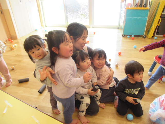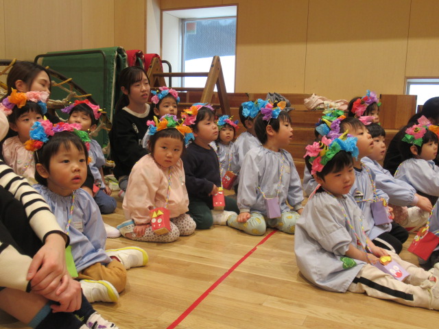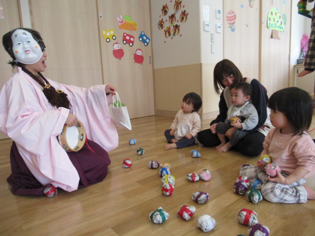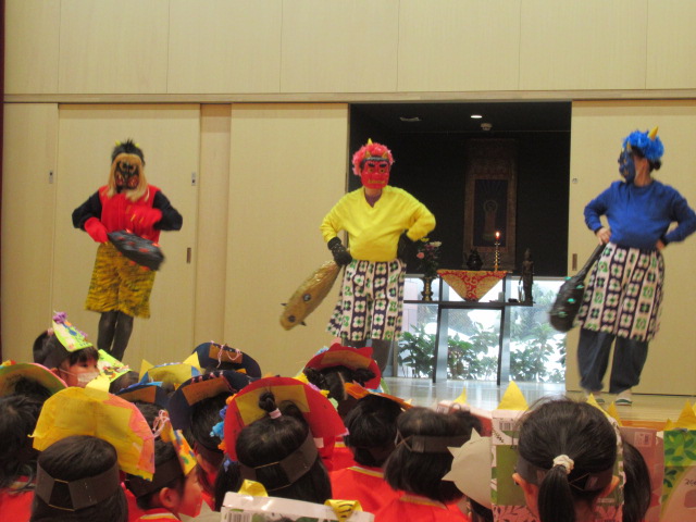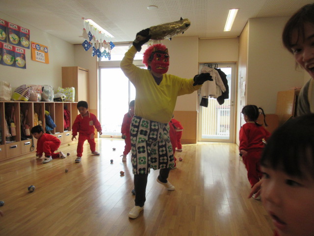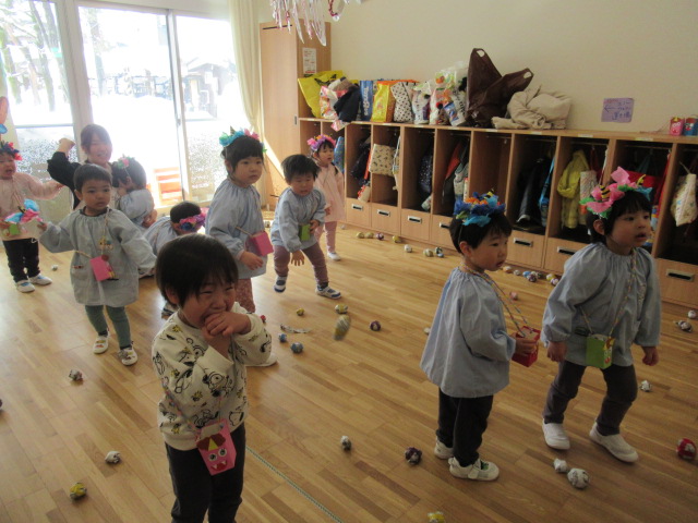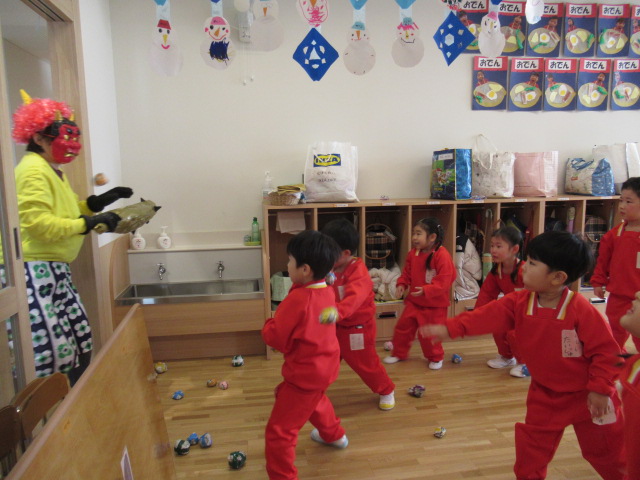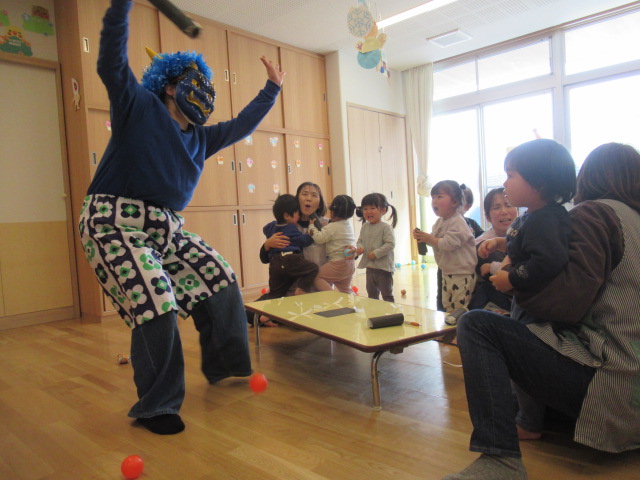 ほしのこ組(0歳児)は、鬼は登場せず、福の神におやつをもらいました。 ほし組(1歳児)は、1体の鬼が登場。泣く子あり、きょとんとみている子ありでした。 つき組(2歳児)は、1体の鬼の登場に、大泣き。福の神からは、しっかりおやつをもらって、にっこりでした。
