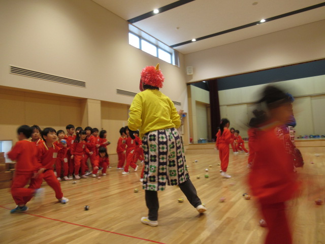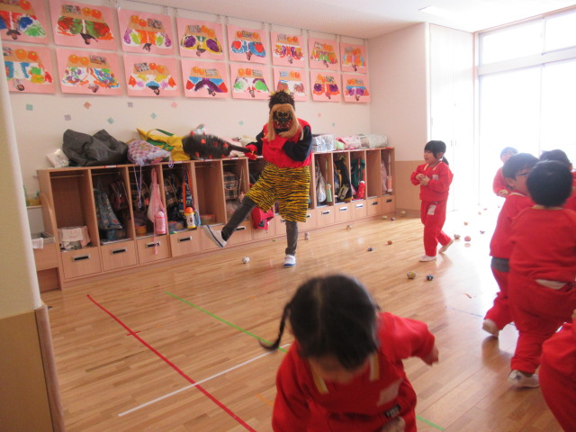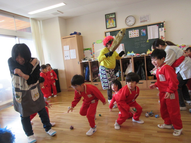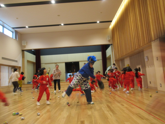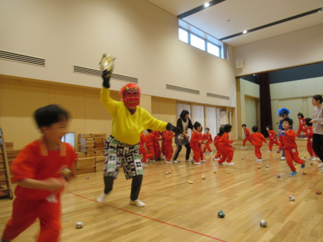 そら組・たいよう組(5歳児)は、遊戯室で豆まき。 手作り豆を投げて、鬼をやっつけるはずが、逃げ惑う子ども達です(^^;)