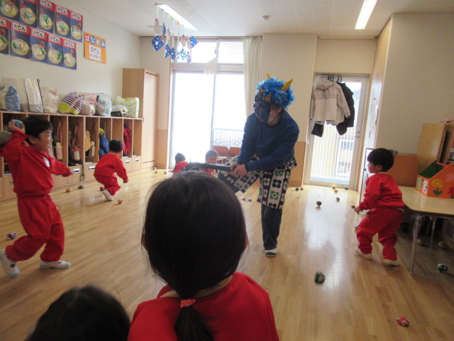 ほし組(1歳児)は、1体の鬼が登場。泣く子あり、きょとんとみている子ありでした。