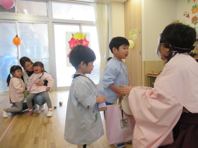 つき組(2歳児)は、1体の鬼の登場に、大泣き。福の神からは、しっかりおやつをもらって、にっこりでした。