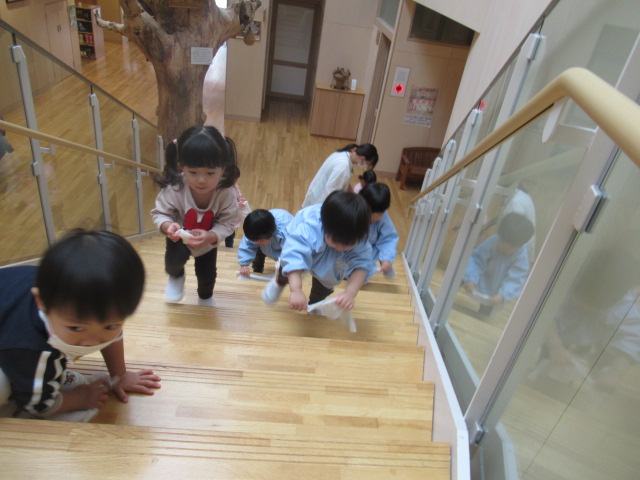【2歳児 お掃除ごっことお昼寝】お部屋の中を拭きふき、廊下も拭きふき、どんどん進んで、2階まで行っちゃった!