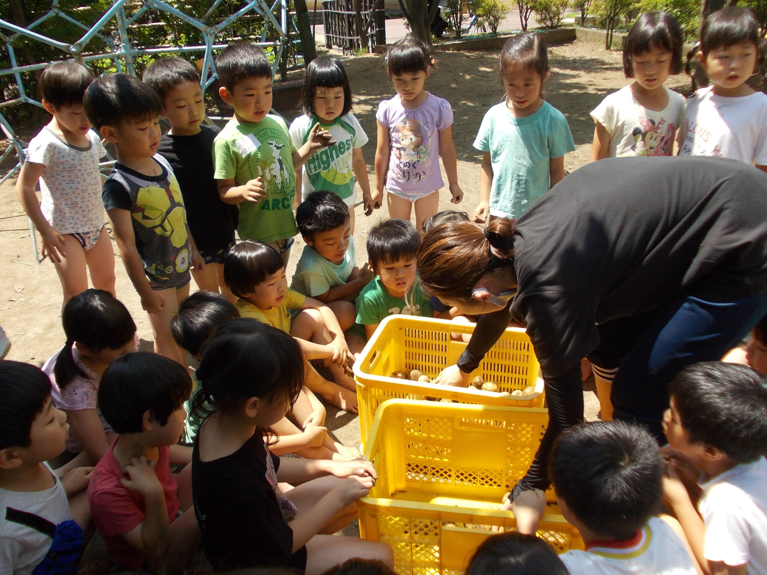 そら組34人の力を合わせて、じゃがいも掘りをしました。