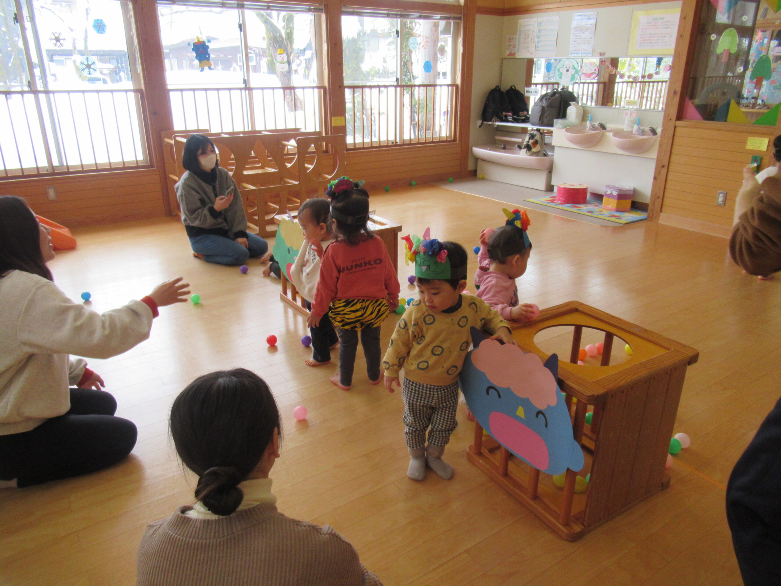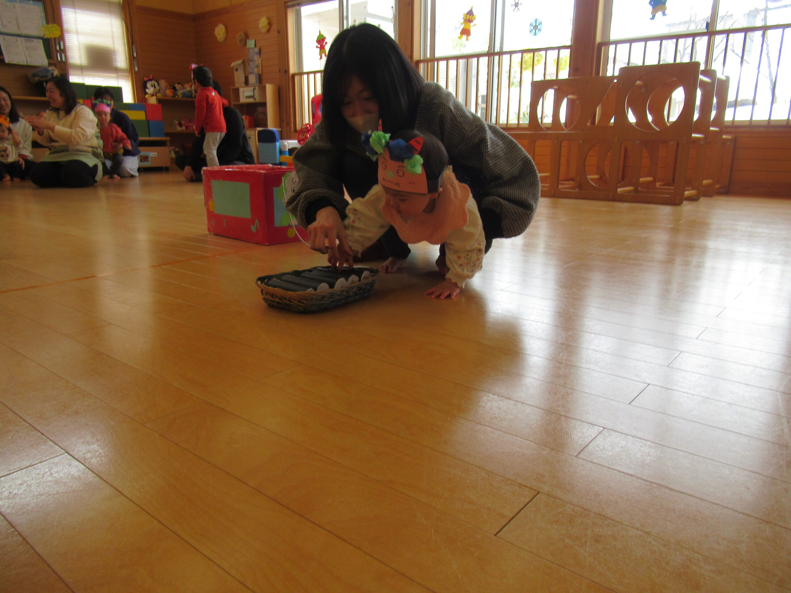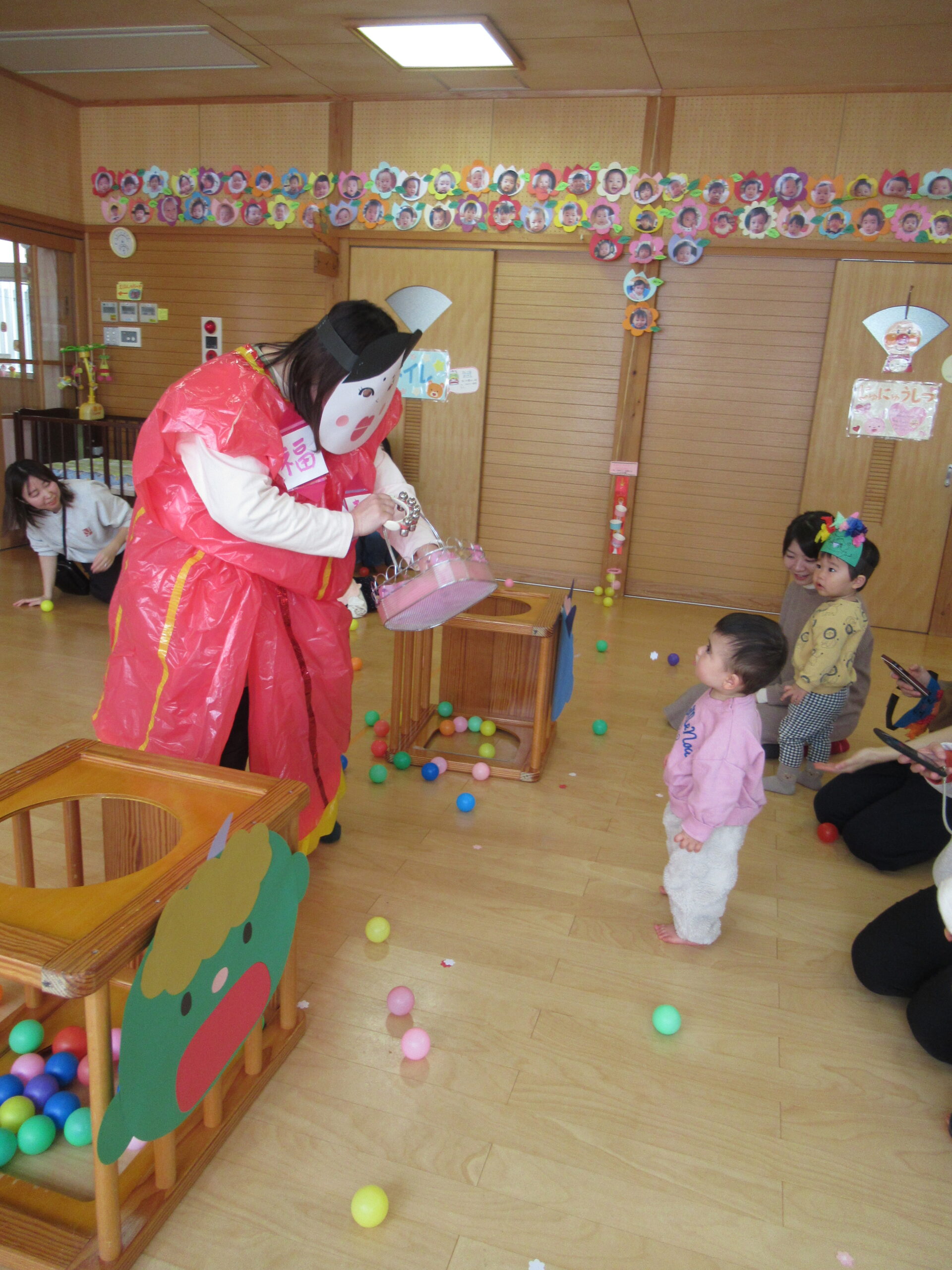 2月3日は、あおぞらの豆まきの会がありました。かわいい鬼のお面を作って、それを被って参加してくれました!レースでは、恵方巻を鬼さんにちょっと怖がりながらも食べさせてあげました♡そして、ボールを投げて豆まきごっこをしていると…。本物の鬼の登場。泣いてしまう子、固まってしまう子と様々な反応でした‼最後は、福の神さんが花びらを撒きながら登場。みんなにお土産を持ってきてくれました♡日本の伝統行事で厄払い。春も一緒に連れてきてくれたかな…☺
