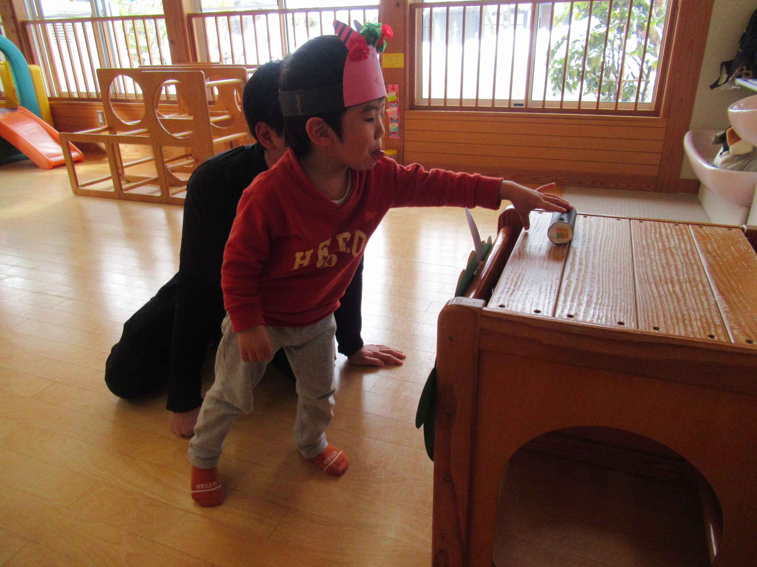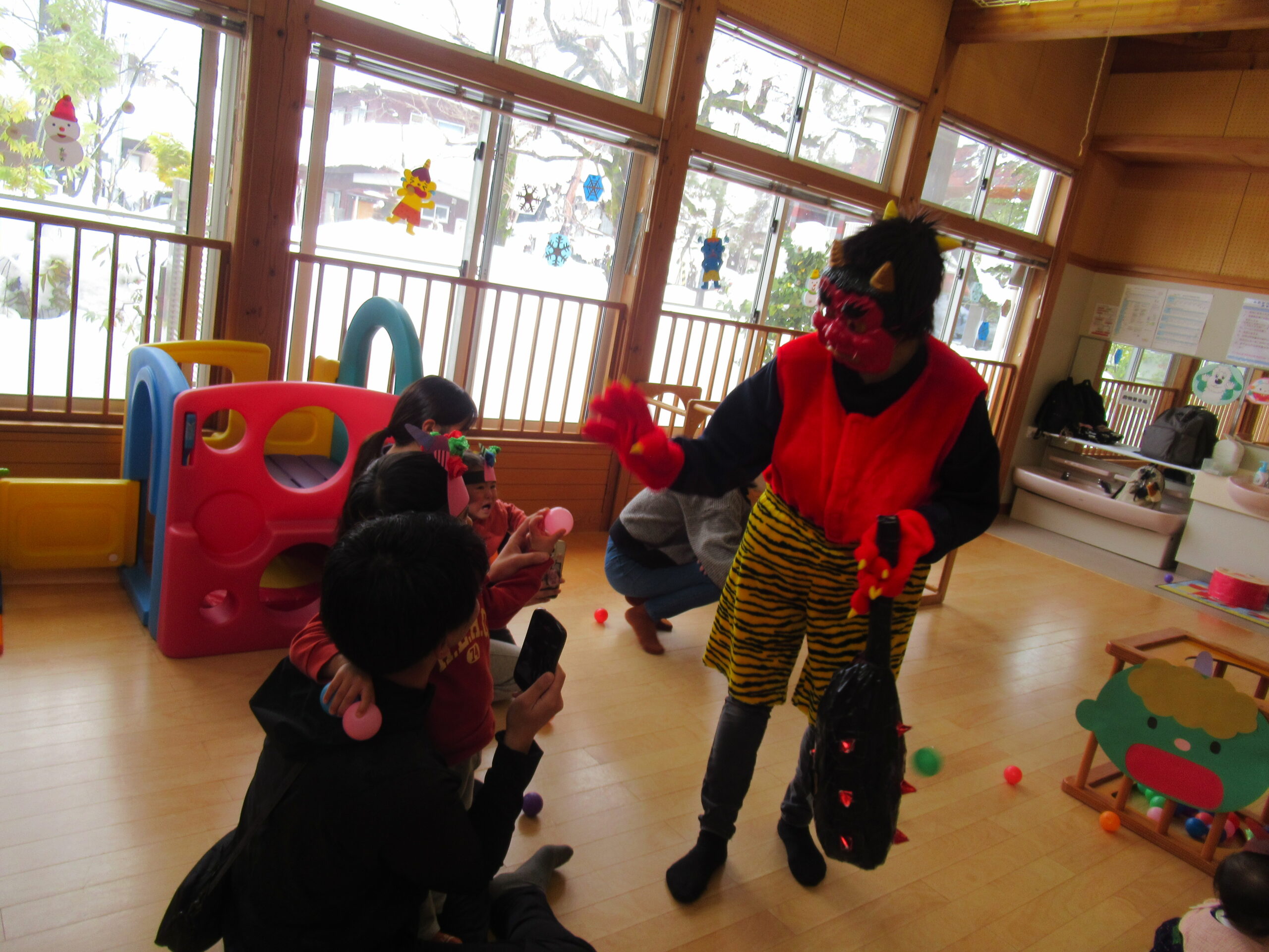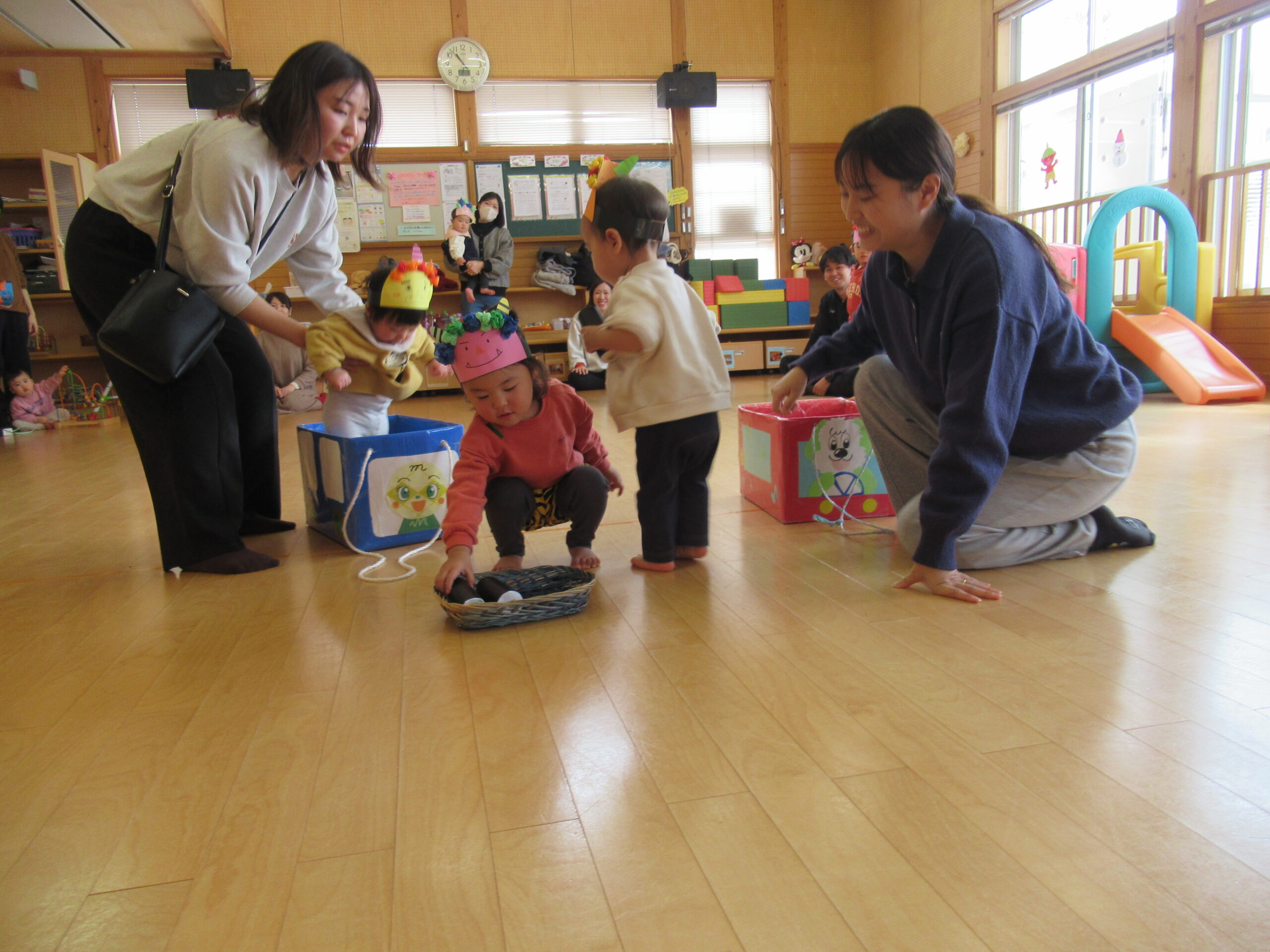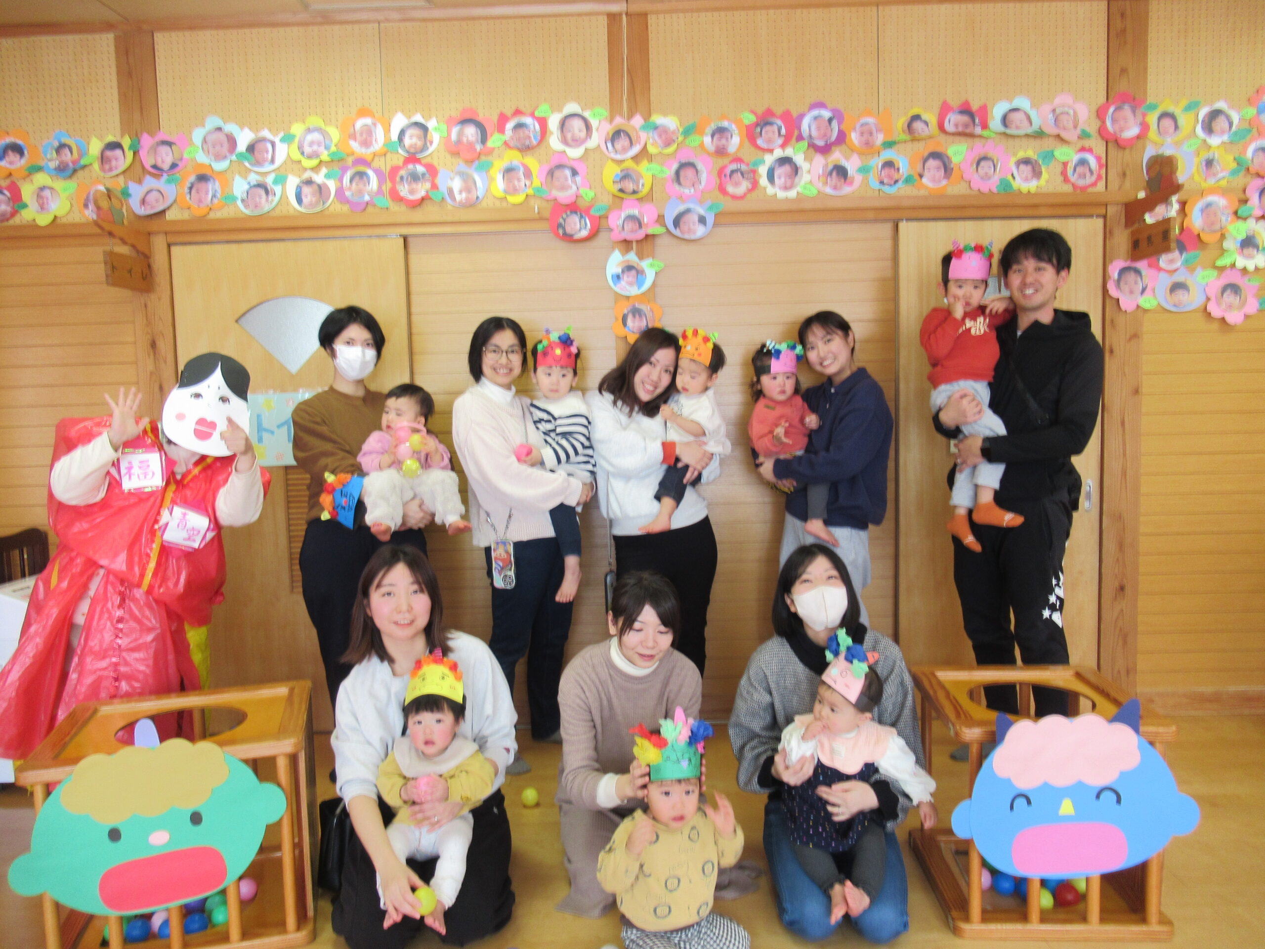 2月3日は、あおぞらの豆まきの会がありました。かわいい鬼のお面を作って、それを被って参加してくれました!レースでは、恵方巻を鬼さんにちょっと怖がりながらも食べさせてあげました♡そして、ボールを投げて豆まきごっこをしていると…。本物の鬼の登場。泣いてしまう子、固まってしまう子と様々な反応でした‼最後は、福の神さんが花びらを撒きながら登場。みんなにお土産を持ってきてくれました♡日本の伝統行事で厄払い。春も一緒に連れてきてくれたかな…☺