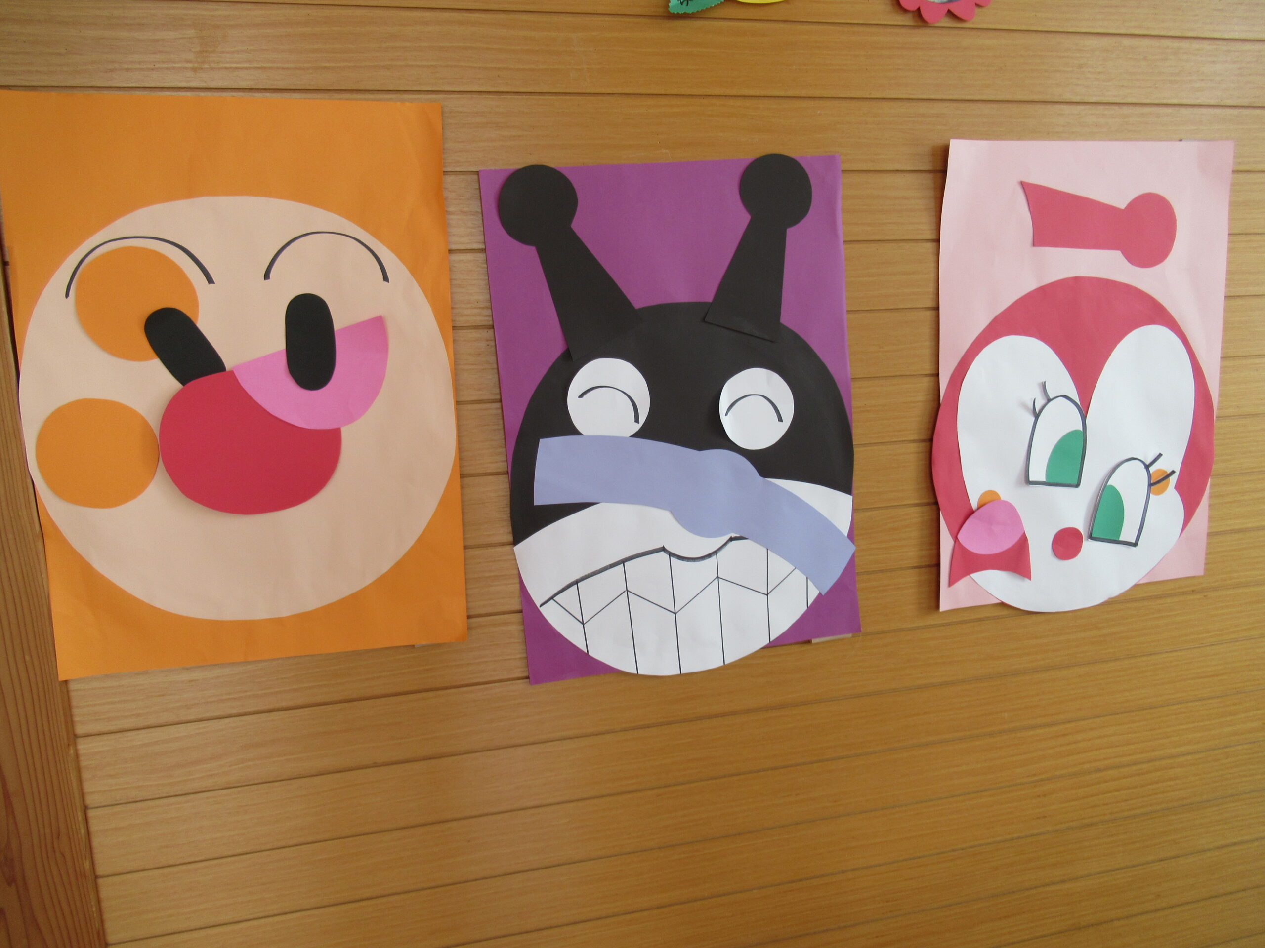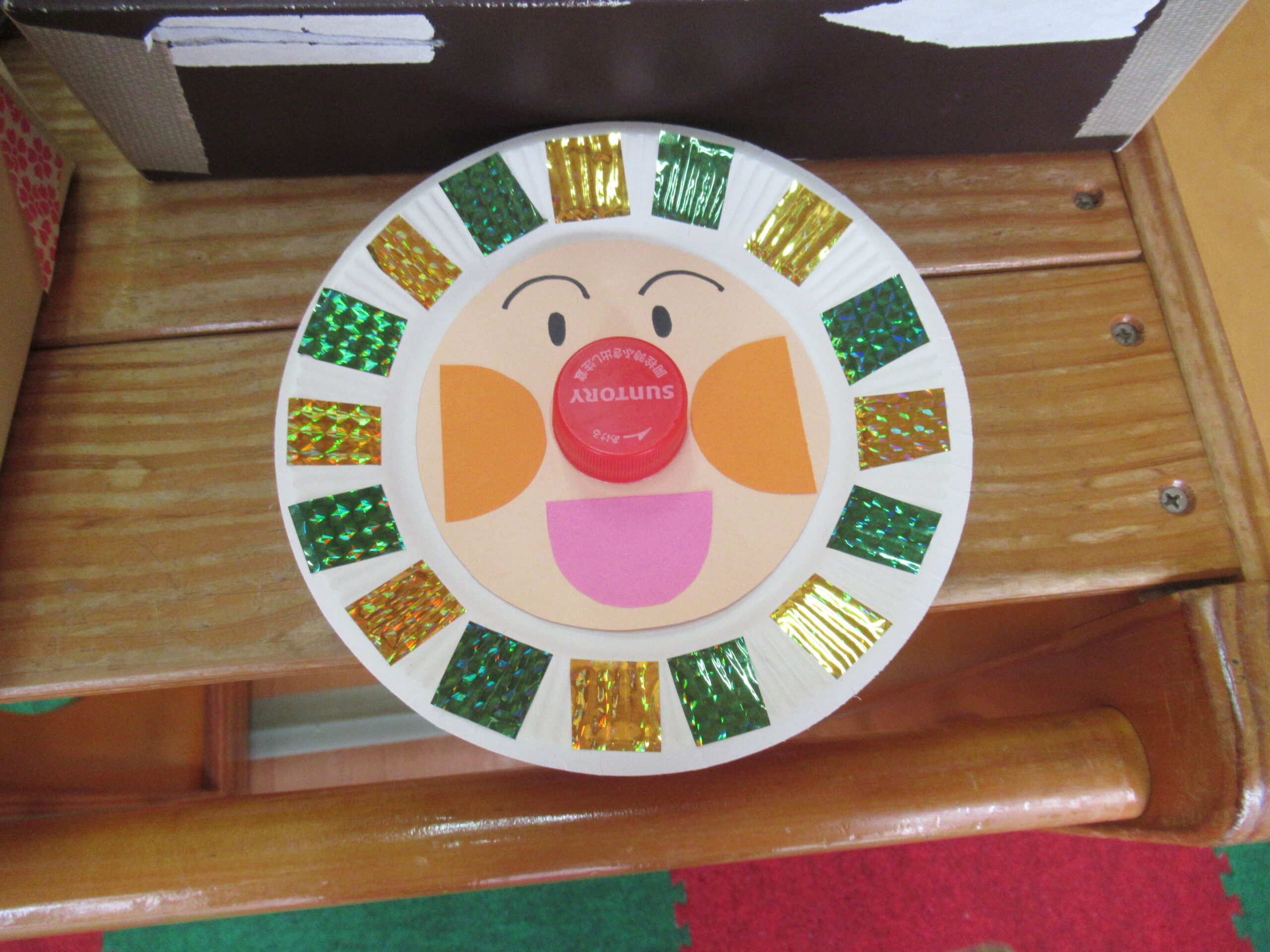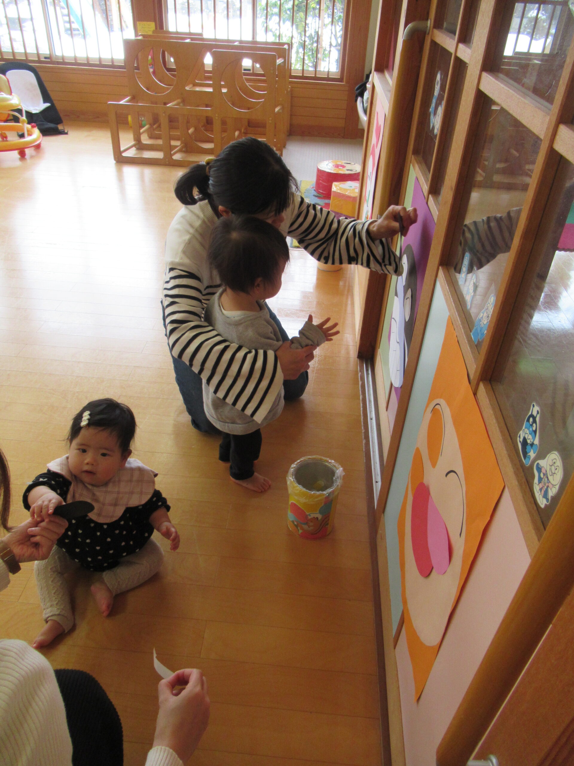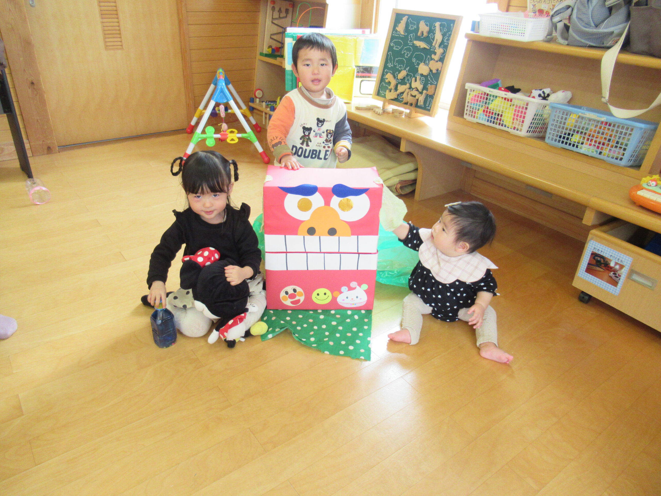 福笑いレースでは、素敵なアンパンマン・バイキンマン・ドキンちゃんが完成しました。獅子舞の登場に少し怖くて涙する子もいましたが、慣れてくると触ってみてにっこり☺最後は、年の初めの運試し!おみくじを引いて、アンパンマンこまをもらって喜んでくれました!!