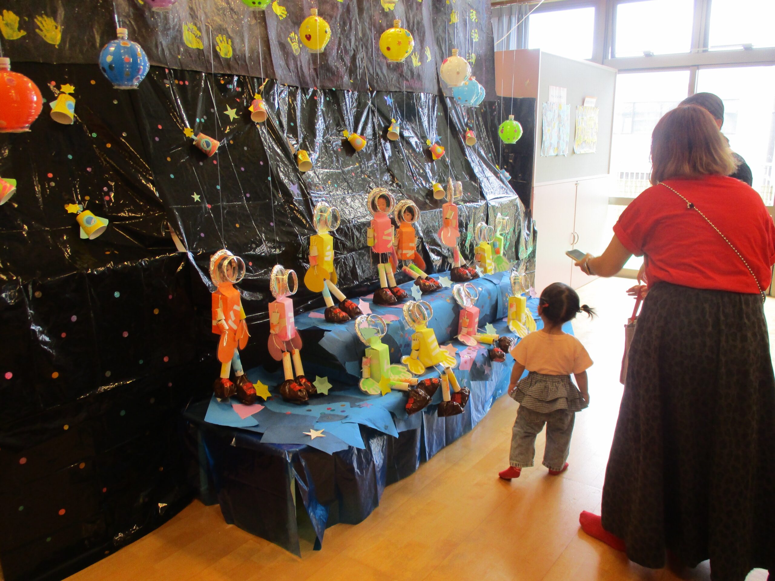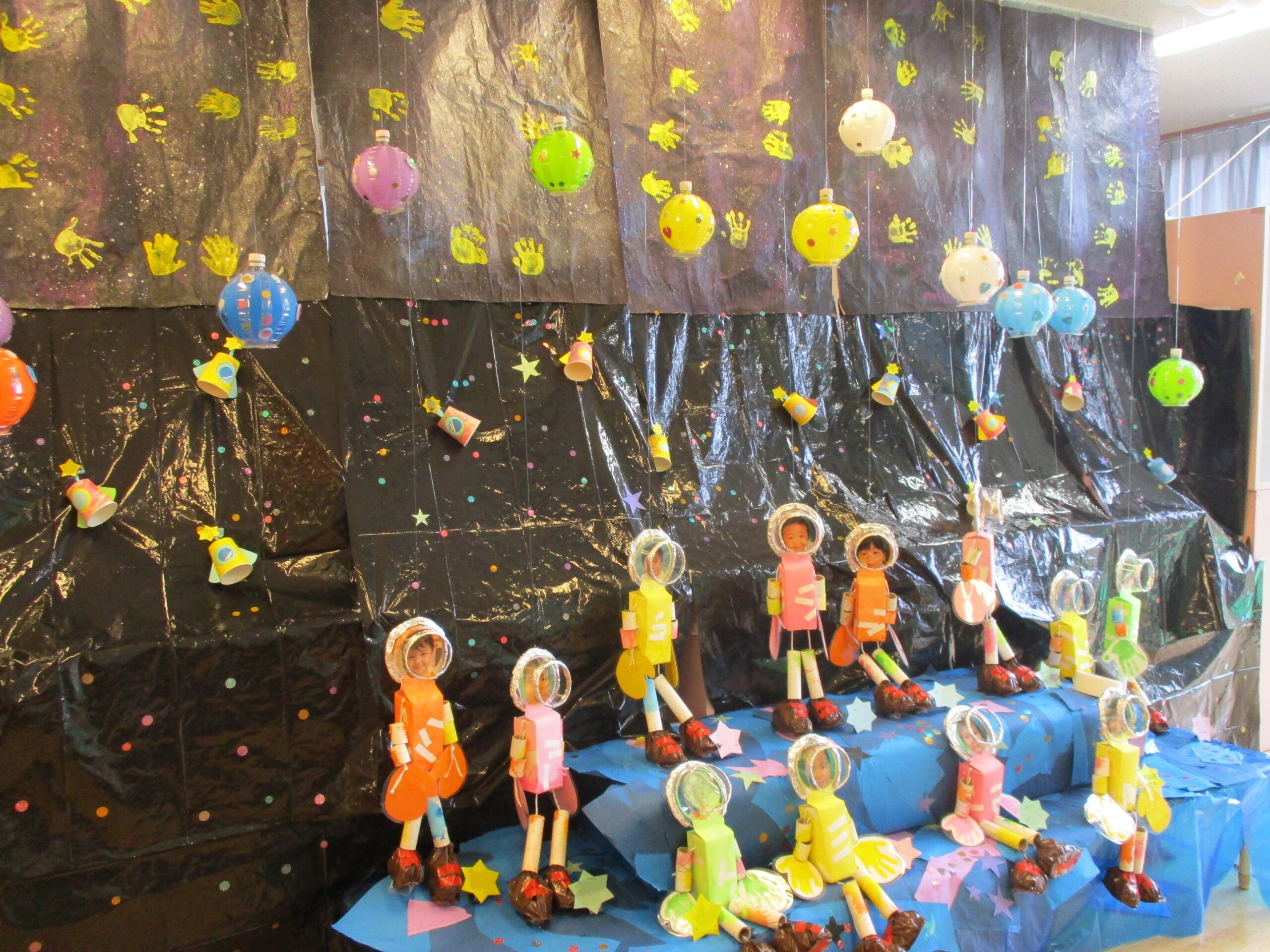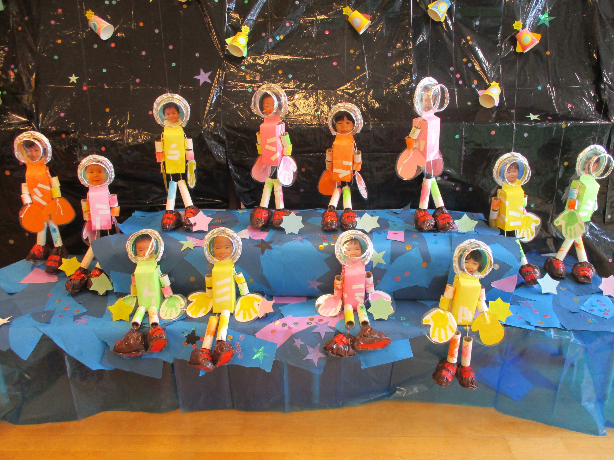 惑星や、ロケット、宇宙服を着てキラキラな宇宙探検を楽しむ子どもたちの展示でした🚀🌠